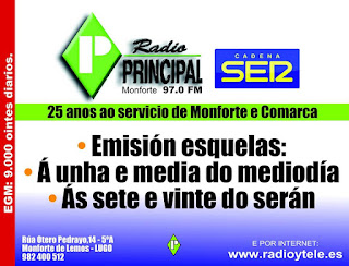 Así pues, parece bastante claro que a Radio Principal Monforte Cadena SER no le ha sentado nada bien que su competencia directa en la localidad, Onda Cero, pretenda ahora <<robarle protagonismo>> al apostar por incluir también en su programación local las "Notas Necrológicas", que tantos beneficios reportan a las emisoras locales, sobre todo en una provincia como la de Lugo.